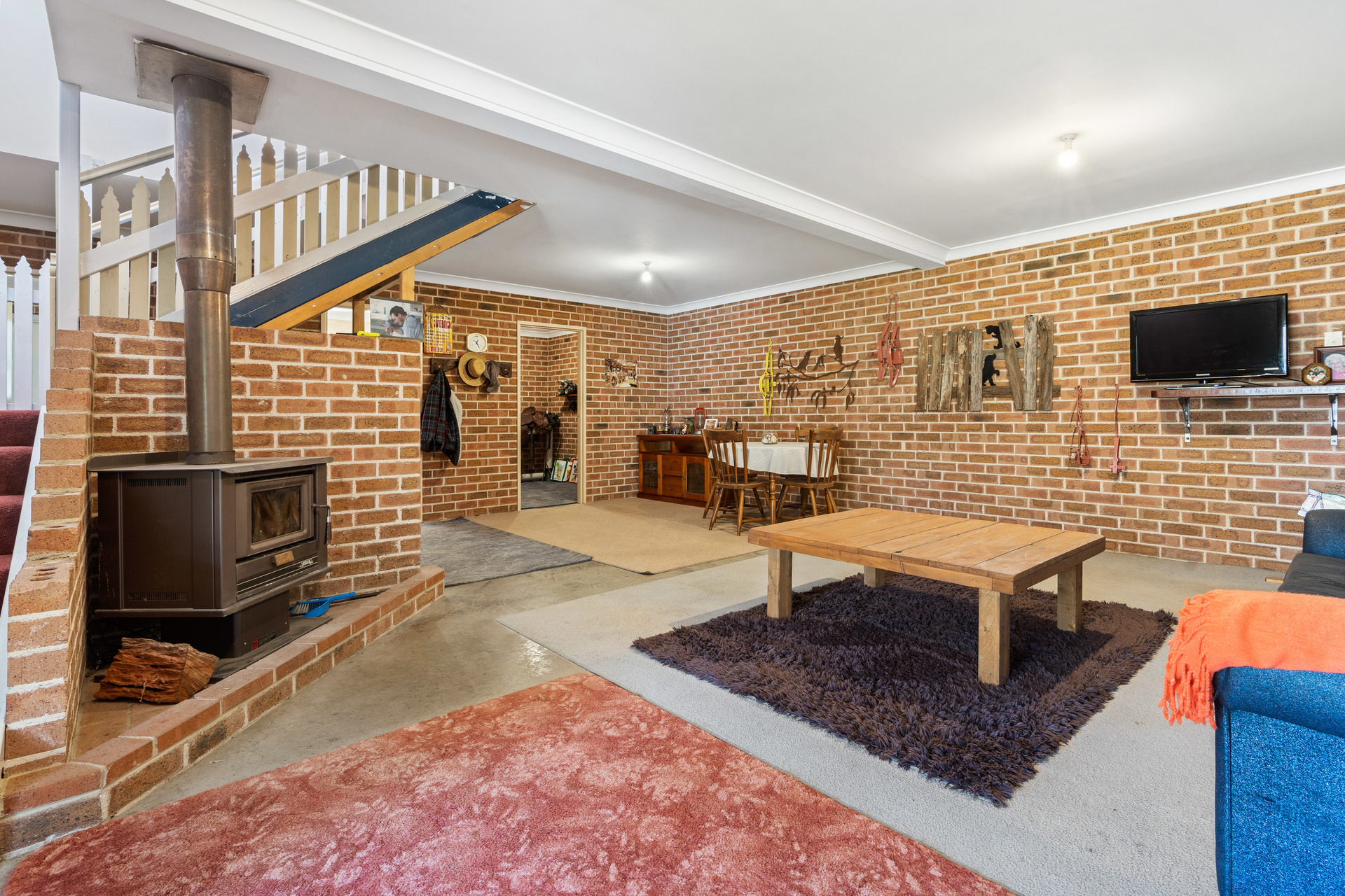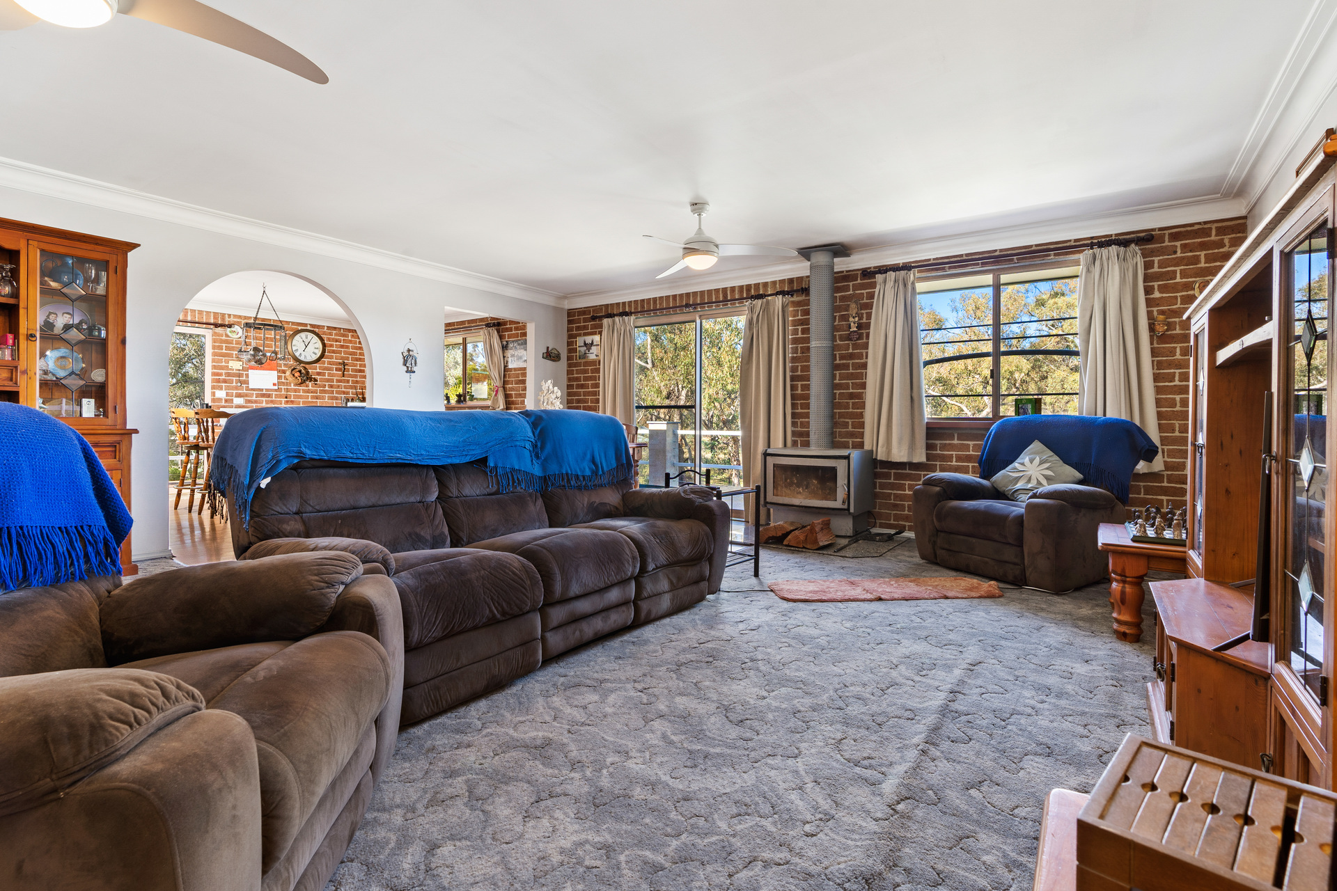 - Elevated entertaining deck with spectacular views of the landscape - Split system heating and cooling, ceiling fans and two free-standing wood fireplaces - Attached double bay garage